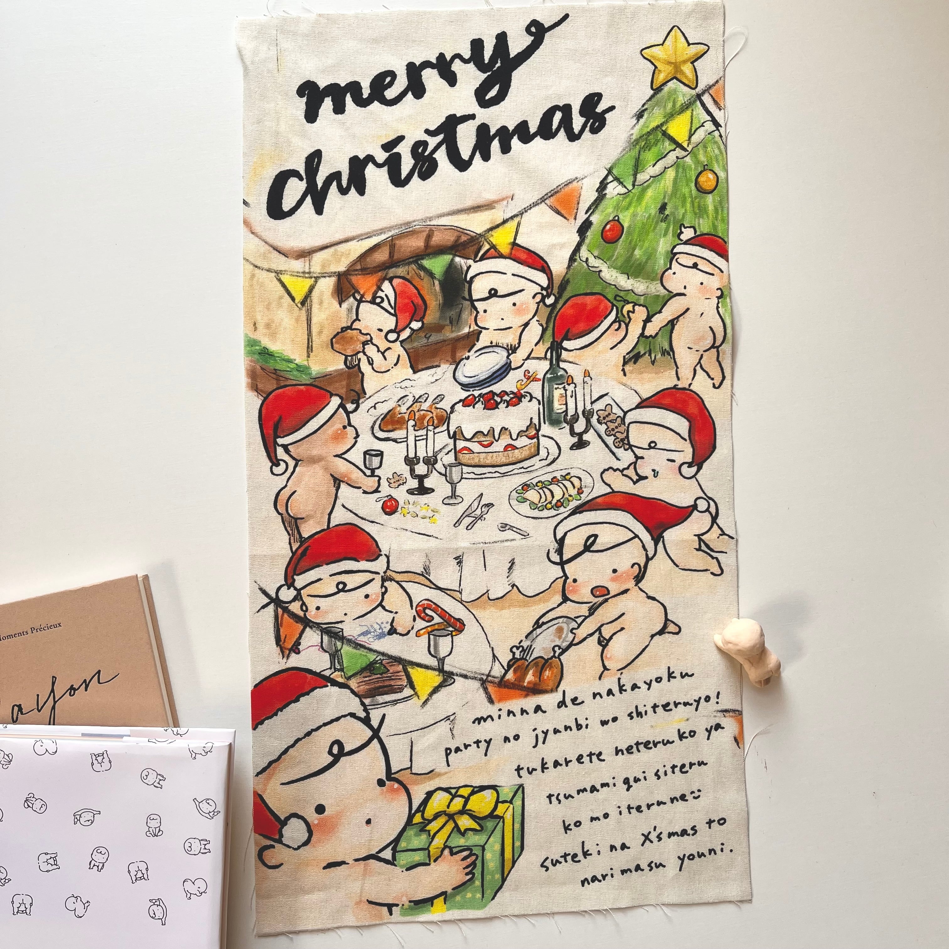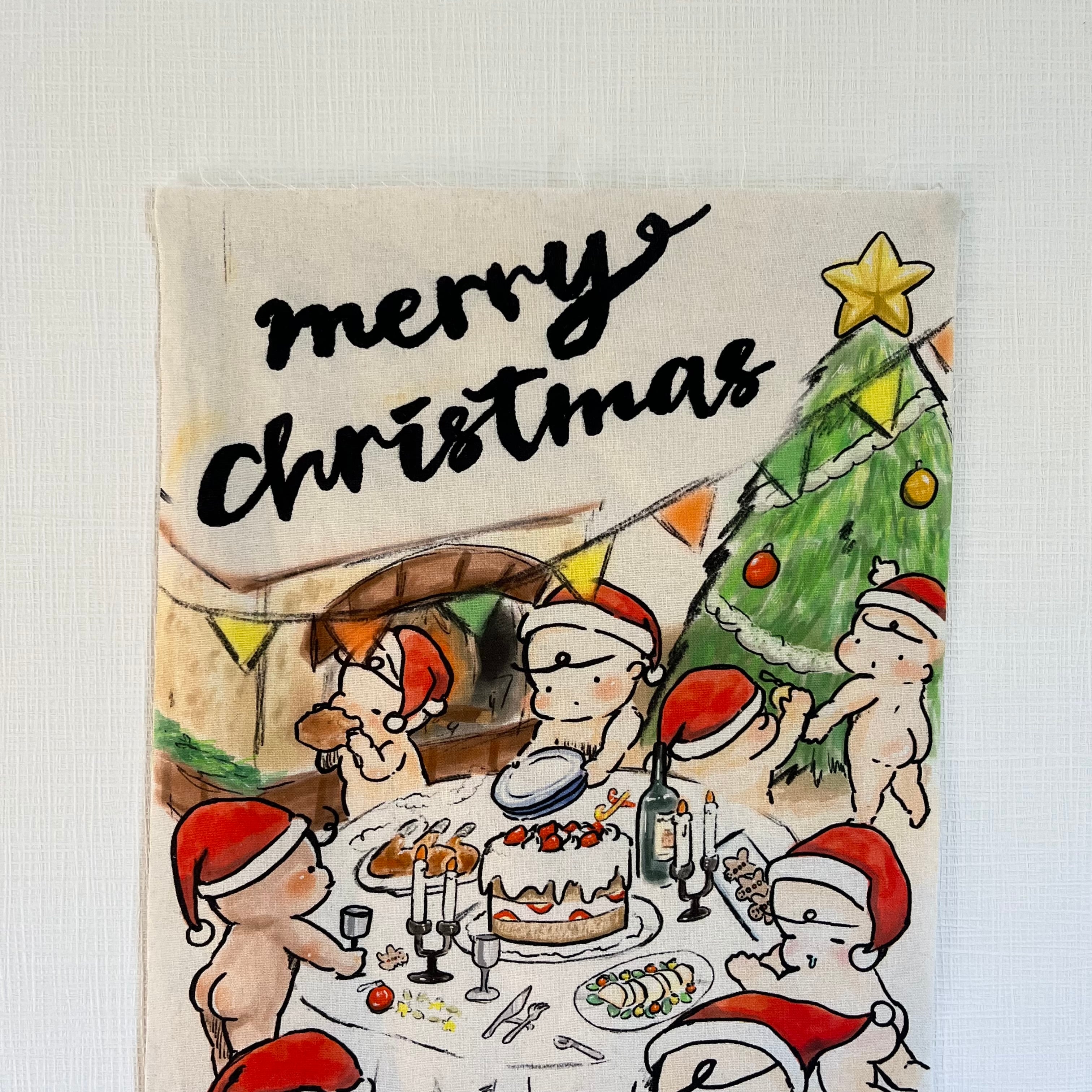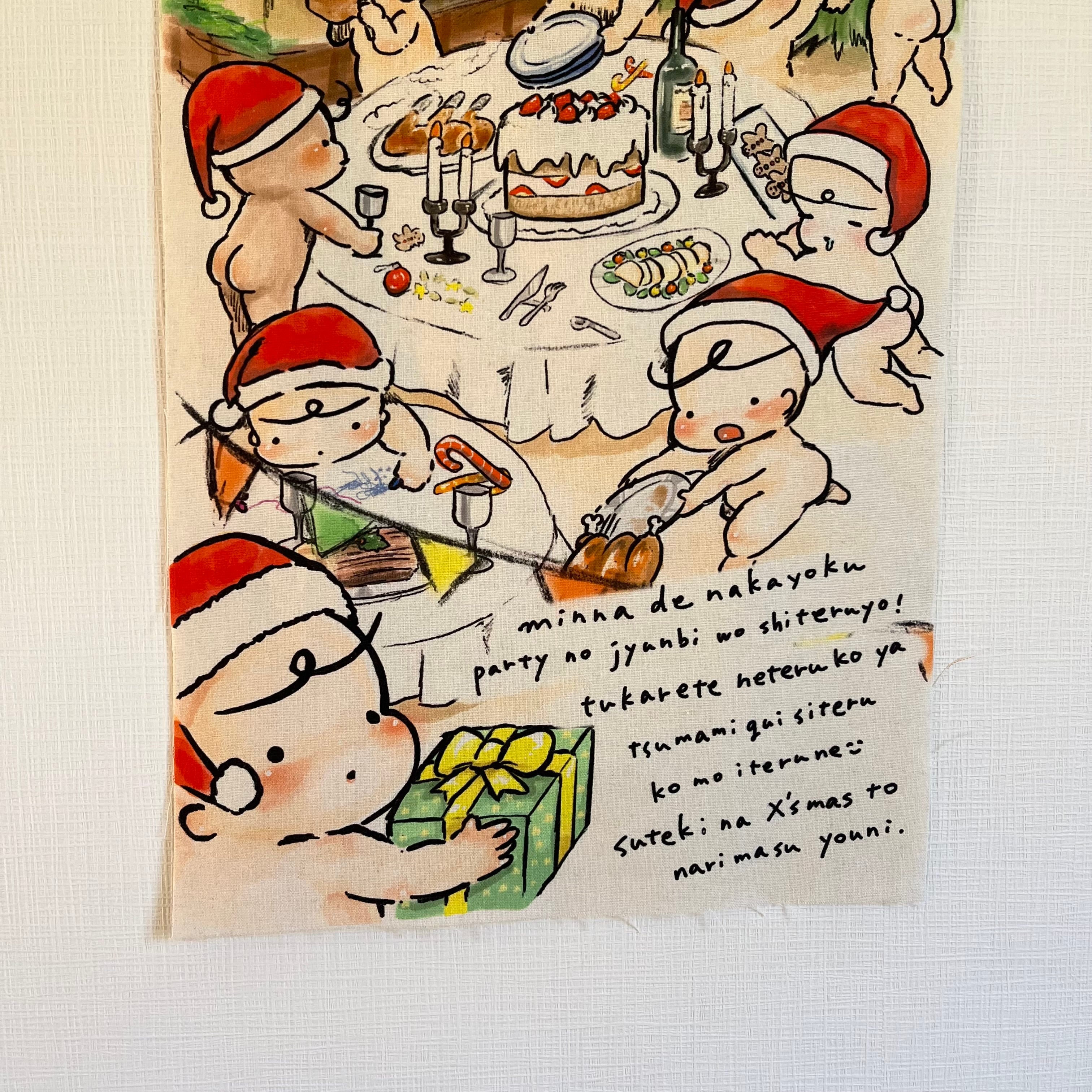 まるで絵本の1ページをそのまま布にしたような賑やかな一枚ですが小さいサイズの為で主張しすぎないので「ツリーとか大きいタペストリーはもうあるしなー…」という方に是非お迎えいただきたいitemです☺️