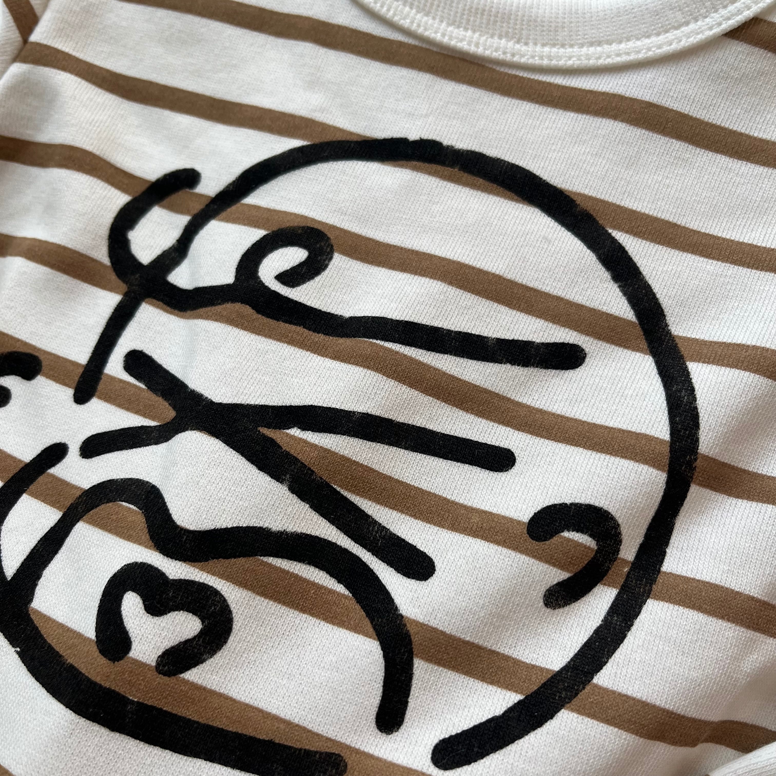 ボーダーのトレーナーにステンシルでポンポン作っておりますのでインクの掠れ具合も「人の手」を感じられる味として楽しんでいただけると幸いです♪